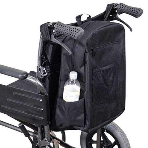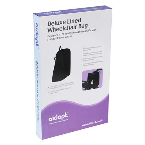 The Deluxe Lined Wheelchair Bag has been specially designed to fit neatly onto the rear of most standard wheelchairs with pram handles and provides multiple zipped storage spaces ideal for larger or small items such as jackets, shopping, medication, money, identification, snacks, etc. It is a practical and affordable wheelchair accessory and enables wheelchair users and their carers to safely carry more, while keeping their hands free. The Deluxe Wheelchair Bag is water resistant and features a large zipped top closure for ease of use. The generously-sized main compartment is fully lined and padded. There is a sturdy carry handle on the top of the bag, plus padded loops on either side which easily slip over the pram handles on the wheelchair. With two small zipped exterior and interior pockets, a mesh front pocket and two small padded size pockets.